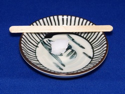 生麩糊を少量、小さ目の角砂糖程度を小皿に取り、水を付けた木箆(きべら)で擂り潰すように練ります。時々、箆に水を付け、糊に水を含ませながら練っていきます。最初は弾力と粘着性がありますが、しだいにさらっとしたゲル状になります。