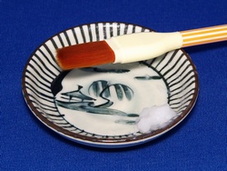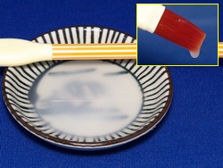 均一なゲル状になったら、スポイトなどで少しずつ水を加えながら腰の強い刷毛で練ります。必要な粘度になるまで水を加え練り続けますが、液状になっても刷毛でしごくようにシツコク練って下さい。